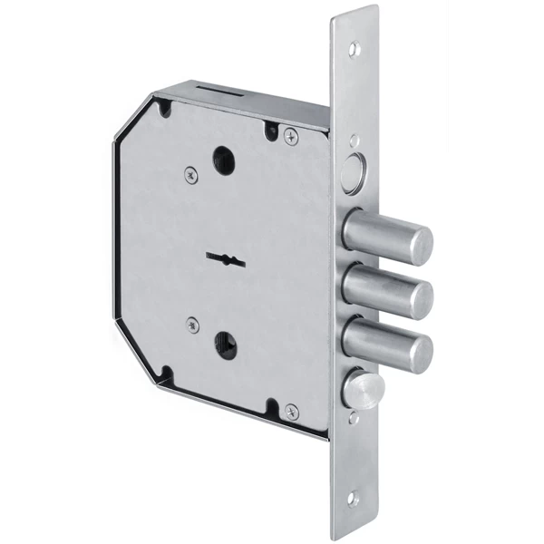 Плоскосувальдный, с двумя внутренними тягами, 3-х ригельный засов, диаметр ригелей, защелки и задвижки - 18 мм, вылет засова 40 мм за 4 оборота, 5 ключей в комплекте. 4 класс.